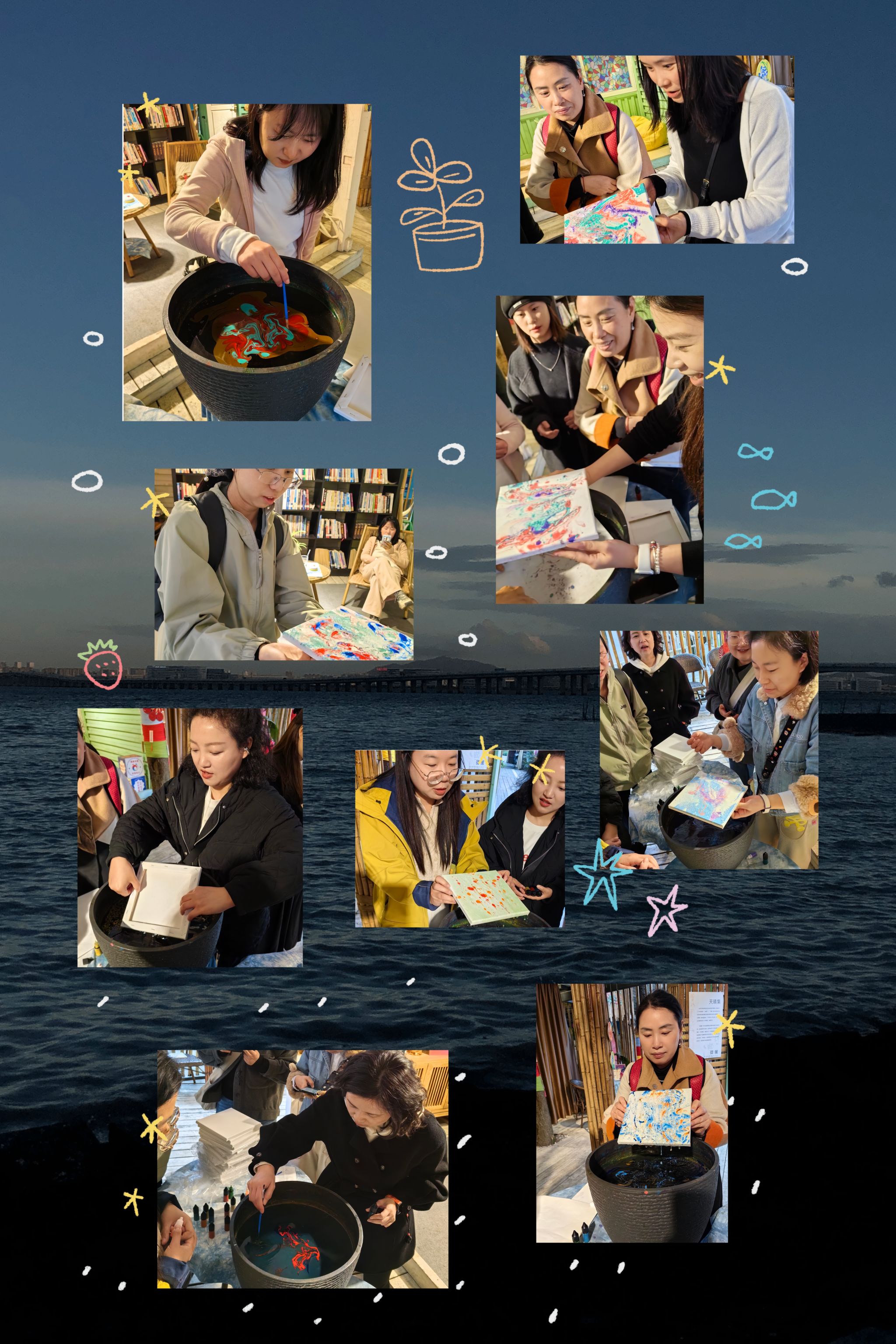 随后,女职工们全身心投入创作之中。大家手持工具,小心翼翼地将漆料滴入水中,然后轻轻拨、挑,看着斑斓的色彩在水面缓缓晕染、交融,或如流云变幻,或似繁花绽放,或像星河璀璨。接着将底板覆于水面,完成创作。