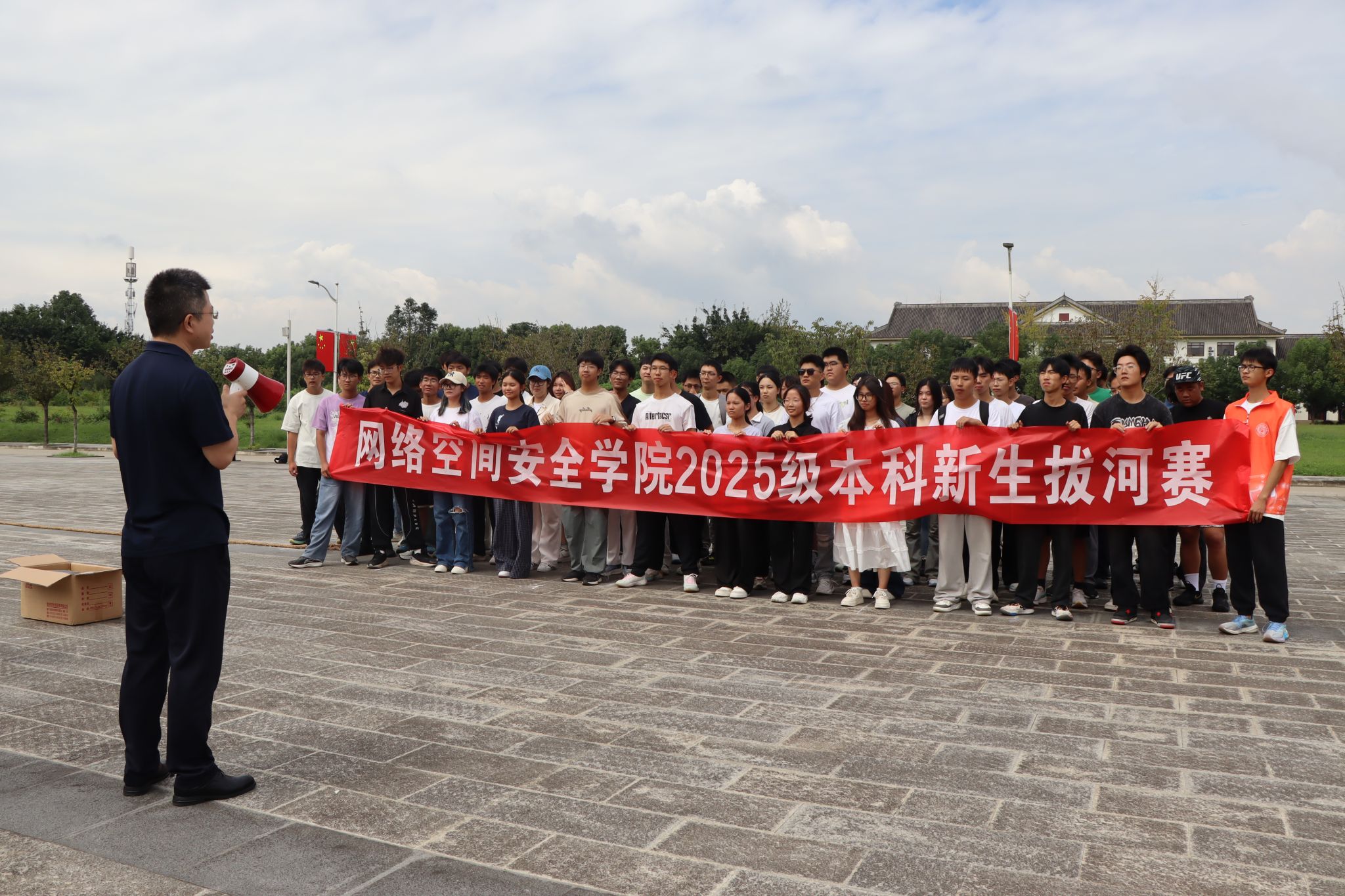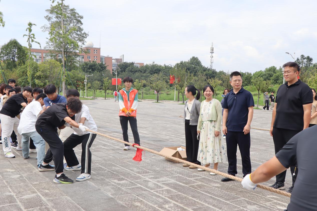 党委副书记陈智勇、学生科副科长贾茜和新生辅导员们为获奖班级颁发奖品。一根麻绳,串联起团结与友爱;一次比拼,传递出勇气与力量。本次拔河比赛增强了2025级新生的集体归属感与班级凝聚力,为新学期的校园生活增添了浓墨重彩的一笔。