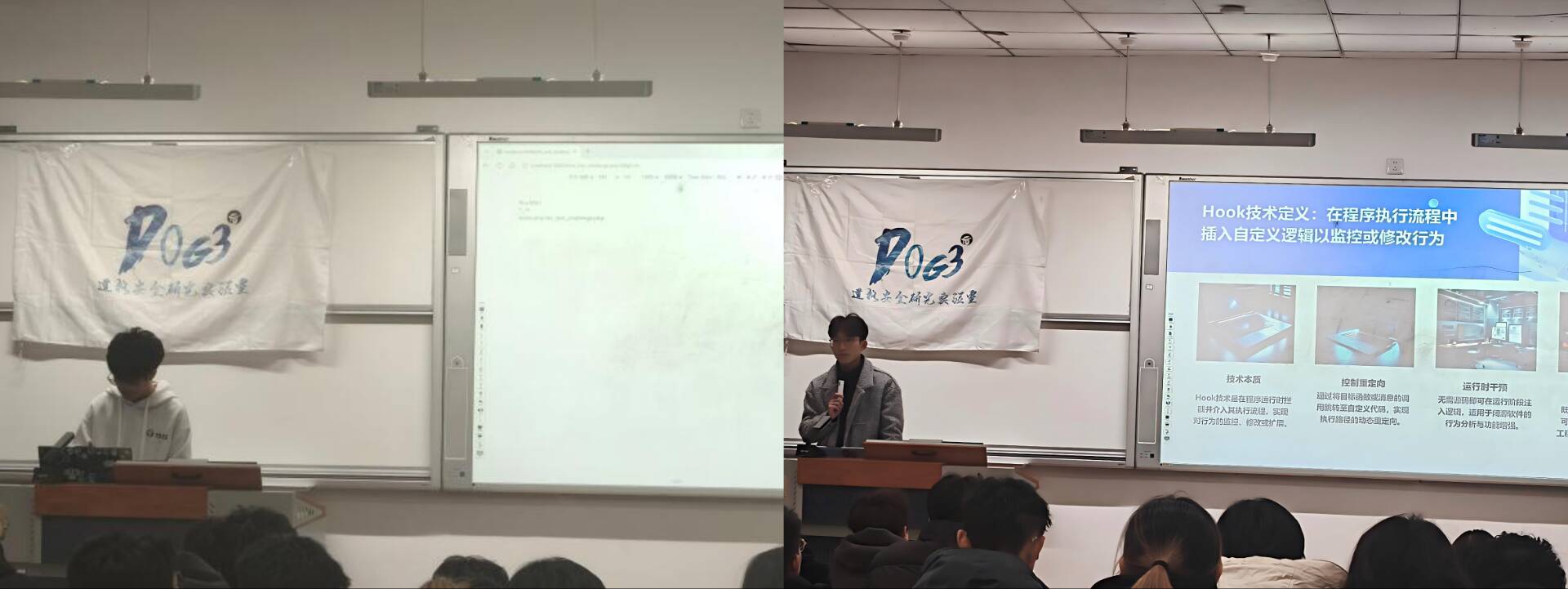 逆向工程板块,主讲人杨叶以Hook技术为主线,深入阐述函数调用拦截及控制流重定向实现机理,现场演示IAT Hook操作流程。针对反病毒软件防护需求,系统阐释行为监控、动态防御等关键技术,客观评估Hook技术稳定性风险。在宣讲尾声,张业浩、张倬两位师傅现场执码演示,还原Hook全流程。